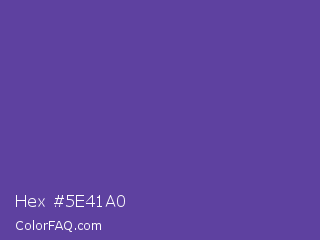 Hex #5e41a0 Color is a normal indigo color and the nearest color is Royal Purple #6b3fa0. Hex code #5e41a0 and RGB value is rgb(94,65,160). In RGB color space, this color is composed of 37% red, 25% green, 63% blue, In CMYK color space, this color is composed of 41% cyan, 59% magenta, 0% yellow , 37% black , In HSL color space, this color has a hue angle of 258° , 42% saturation and 44% lightness.