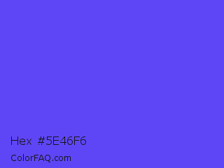 Hex #5e46f6 Color is a light indigo color and the nearest color is Majorelle Blue #6050dc. Hex code #5e46f6 and RGB value is rgb(94,70,246). In RGB color space, this color is composed of 37% red, 27% green, 96% blue, In CMYK color space, this color is composed of 62% cyan, 72% magenta, 0% yellow , 4% black , In HSL color space, this color has a hue angle of 248° , 91% saturation and 62% lightness.