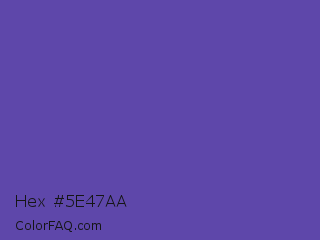 Hex #5e47aa Color is a normal indigo color and the nearest color is Plump Purple #5946b2. Hex code #5e47aa and RGB value is rgb(94,71,170). In RGB color space, this color is composed of 37% red, 28% green, 67% blue, In CMYK color space, this color is composed of 45% cyan, 58% magenta, 0% yellow , 33% black , In HSL color space, this color has a hue angle of 254° , 41% saturation and 47% lightness.