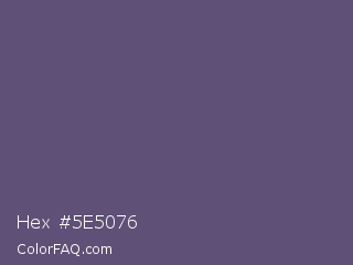 Hex #5e5076 Color is a normal violet color and the nearest color is Smoky #605b73. Hex code #5e5076 and RGB value is rgb(94,80,118). In RGB color space, this color is composed of 37% red, 31% green, 46% blue, In CMYK color space, this color is composed of 20% cyan, 32% magenta, 0% yellow , 54% black , In HSL color space, this color has a hue angle of 262° , 19% saturation and 39% lightness.