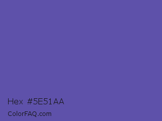 Hex #5e51aa Color is a normal indigo color and the nearest color is Liberty #545aa7. Hex code #5e51aa and RGB value is rgb(94,81,170). In RGB color space, this color is composed of 37% red, 32% green, 67% blue, In CMYK color space, this color is composed of 45% cyan, 52% magenta, 0% yellow , 33% black , In HSL color space, this color has a hue angle of 249° , 35% saturation and 49% lightness.