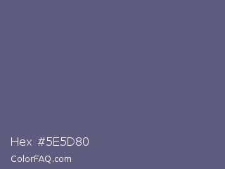 Hex #5e5d80 Color is a normal indigo color and the nearest color is Comet #5c5d75. Hex code #5e5d80 and RGB value is rgb(94,93,128). In RGB color space, this color is composed of 37% red, 36% green, 50% blue, In CMYK color space, this color is composed of 27% cyan, 27% magenta, 0% yellow , 50% black , In HSL color space, this color has a hue angle of 242° , 16% saturation and 43% lightness.