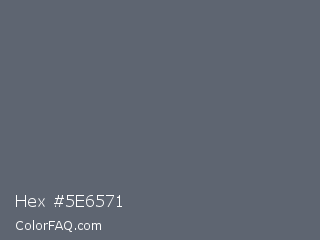 Hex #5e6571 Color is a normal blue color and the nearest color is Shuttle Gray #5f6672. Hex code #5e6571 and RGB value is rgb(94,101,113). In RGB color space, this color is composed of 37% red, 40% green, 44% blue, In CMYK color space, this color is composed of 17% cyan, 11% magenta, 0% yellow , 56% black , In HSL color space, this color has a hue angle of 218° , 9% saturation and 41% lightness.