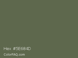 Hex #5e684d Color is a normal green color and the nearest color is Finch #626649. Hex code #5e684d and RGB value is rgb(94,104,77). In RGB color space, this color is composed of 37% red, 41% green, 30% blue, In CMYK color space, this color is composed of 10% cyan, 0% magenta, 26% yellow , 59% black , In HSL color space, this color has a hue angle of 82° , 15% saturation and 35% lightness.