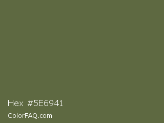 Hex #5e6941 Color is a normal lime color and the nearest color is Finch #626649. Hex code #5e6941 and RGB value is rgb(94,105,65). In RGB color space, this color is composed of 37% red, 41% green, 25% blue, In CMYK color space, this color is composed of 10% cyan, 0% magenta, 38% yellow , 59% black , In HSL color space, this color has a hue angle of 77° , 24% saturation and 33% lightness.