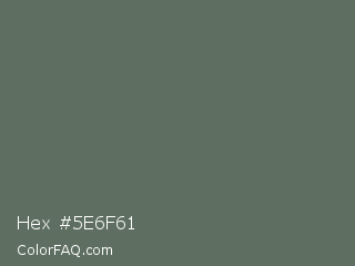 Hex #5e6f61 Color is a normal green color and the nearest color is Corduroy #606e68. Hex code #5e6f61 and RGB value is rgb(94,111,97). In RGB color space, this color is composed of 37% red, 44% green, 38% blue, In CMYK color space, this color is composed of 15% cyan, 0% magenta, 13% yellow , 56% black , In HSL color space, this color has a hue angle of 131° , 8% saturation and 40% lightness.