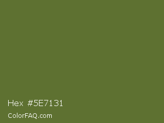Hex #5e7131 Color is a normal lime color and the nearest color is Dark Olive Green #556b2f. Hex code #5e7131 and RGB value is rgb(94,113,49). In RGB color space, this color is composed of 37% red, 44% green, 19% blue, In CMYK color space, this color is composed of 17% cyan, 0% magenta, 57% yellow , 56% black , In HSL color space, this color has a hue angle of 78° , 40% saturation and 32% lightness.