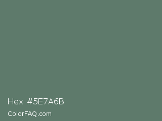 Hex #5e7a6b Color is a normal green color and the nearest color is Corduroy #606e68. Hex code #5e7a6b and RGB value is rgb(94,122,107). In RGB color space, this color is composed of 37% red, 48% green, 42% blue, In CMYK color space, this color is composed of 23% cyan, 0% magenta, 12% yellow , 52% black , In HSL color space, this color has a hue angle of 148° , 13% saturation and 42% lightness.