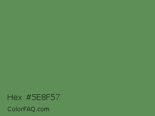 Hex #5e8f57 Color is a normal green color and the nearest color is Glade Green #61845f. Hex code #5e8f57 and RGB value is rgb(94,143,87). In RGB color space, this color is composed of 37% red, 56% green, 34% blue, In CMYK color space, this color is composed of 34% cyan, 0% magenta, 39% yellow , 44% black , In HSL color space, this color has a hue angle of 113° , 24% saturation and 45% lightness.
