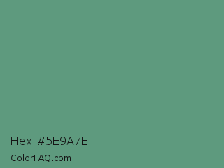 Hex #5e9a7e Color is a normal green color and the nearest color is Shiny Shamrock #5fa778. Hex code #5e9a7e and RGB value is rgb(94,154,126). In RGB color space, this color is composed of 37% red, 60% green, 49% blue, In CMYK color space, this color is composed of 39% cyan, 0% magenta, 18% yellow , 40% black , In HSL color space, this color has a hue angle of 152° , 24% saturation and 49% lightness.