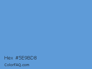 Hex #5e9bd8 Color is a light blue color and the nearest color is Carolina Blue #56a0d3. Hex code #5e9bd8 and RGB value is rgb(94,155,216). In RGB color space, this color is composed of 37% red, 61% green, 85% blue, In CMYK color space, this color is composed of 56% cyan, 28% magenta, 0% yellow , 15% black , In HSL color space, this color has a hue angle of 210° , 61% saturation and 61% lightness.