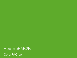 Hex #5eab2b Color is a normal green color and the nearest color is Green RYB #66b032. Hex code #5eab2b and RGB value is rgb(94,171,43). In RGB color space, this color is composed of 37% red, 67% green, 17% blue, In CMYK color space, this color is composed of 45% cyan, 0% magenta, 75% yellow , 33% black , In HSL color space, this color has a hue angle of 96° , 60% saturation and 42% lightness.
