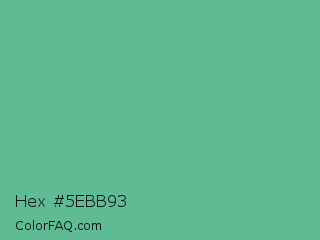 Hex #5ebb93 Color is a normal green color and the nearest color is Silver Tree #66b58f. Hex code #5ebb93 and RGB value is rgb(94,187,147). In RGB color space, this color is composed of 37% red, 73% green, 58% blue, In CMYK color space, this color is composed of 50% cyan, 0% magenta, 21% yellow , 27% black , In HSL color space, this color has a hue angle of 154° , 41% saturation and 55% lightness.