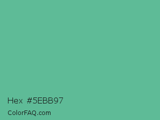 Hex #5ebb97 Color is a normal green color and the nearest color is Silver Tree #66b58f. Hex code #5ebb97 and RGB value is rgb(94,187,151). In RGB color space, this color is composed of 37% red, 73% green, 59% blue, In CMYK color space, this color is composed of 50% cyan, 0% magenta, 19% yellow , 27% black , In HSL color space, this color has a hue angle of 157° , 41% saturation and 55% lightness.