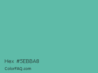 Hex #5ebba8 Color is a normal cyan color and the nearest color is Tradewind #5fb3ac. Hex code #5ebba8 and RGB value is rgb(94,187,168). In RGB color space, this color is composed of 37% red, 73% green, 66% blue, In CMYK color space, this color is composed of 50% cyan, 0% magenta, 10% yellow , 27% black , In HSL color space, this color has a hue angle of 168° , 41% saturation and 55% lightness.