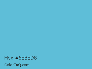 Hex #5ebed8 Color is a light cyan color and the nearest color is Viking #64ccdb. Hex code #5ebed8 and RGB value is rgb(94,190,216). In RGB color space, this color is composed of 37% red, 75% green, 85% blue, In CMYK color space, this color is composed of 56% cyan, 12% magenta, 0% yellow , 15% black , In HSL color space, this color has a hue angle of 193° , 61% saturation and 61% lightness.