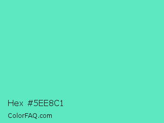 Hex #5ee8c1 Color is a light green color and the nearest color is Medium Aquamarine #66ddaa. Hex code #5ee8c1 and RGB value is rgb(94,232,193). In RGB color space, this color is composed of 37% red, 91% green, 76% blue, In CMYK color space, this color is composed of 59% cyan, 0% magenta, 17% yellow , 9% black , In HSL color space, this color has a hue angle of 163° , 75% saturation and 64% lightness.