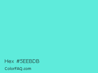 Hex #5eebdb Color is a light cyan color and the nearest color is Turquoise Blue #6cdae7. Hex code #5eebdb and RGB value is rgb(94,235,219). In RGB color space, this color is composed of 37% red, 92% green, 86% blue, In CMYK color space, this color is composed of 60% cyan, 0% magenta, 7% yellow , 8% black , In HSL color space, this color has a hue angle of 173° , 78% saturation and 65% lightness.
