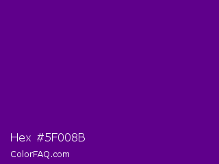 Hex #5f008b Color is a dark purple color and the nearest color is Purple #660099. Hex code #5f008b and RGB value is rgb(95,0,139). In RGB color space, this color is composed of 37% red, 0% green, 55% blue, In CMYK color space, this color is composed of 32% cyan, 100% magenta, 0% yellow , 45% black , In HSL color space, this color has a hue angle of 281° , 100% saturation and 27% lightness.