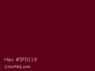 Hex #5f0119 Color is a very dark red color and the nearest color is Bordeaux #5c0120. Hex code #5f0119 and RGB value is rgb(95,1,25). In RGB color space, this color is composed of 37% red, 0% green, 10% blue, In CMYK color space, this color is composed of 0% cyan, 99% magenta, 74% yellow , 63% black , In HSL color space, this color has a hue angle of 345° , 98% saturation and 19% lightness.