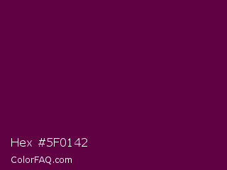 Hex #5f0142 Color is a very dark magenta color and the nearest color is Pompadour #660045. Hex code #5f0142 and RGB value is rgb(95,1,66). In RGB color space, this color is composed of 37% red, 0% green, 26% blue, In CMYK color space, this color is composed of 0% cyan, 99% magenta, 31% yellow , 63% black , In HSL color space, this color has a hue angle of 319° , 98% saturation and 19% lightness.