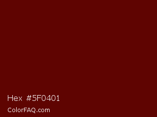 Hex #5f0401 Color is a very dark red color and the nearest color is Rosewood #65000b. Hex code #5f0401 and RGB value is rgb(95,4,1). In RGB color space, this color is composed of 37% red, 2% green, 0% blue, In CMYK color space, this color is composed of 0% cyan, 96% magenta, 99% yellow , 63% black , In HSL color space, this color has a hue angle of 2° , 98% saturation and 19% lightness.