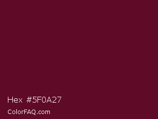 Hex #5f0a27 Color is a very dark rose color and the nearest color is Bordeaux #5c0120. Hex code #5f0a27 and RGB value is rgb(95,10,39). In RGB color space, this color is composed of 37% red, 4% green, 15% blue, In CMYK color space, this color is composed of 0% cyan, 89% magenta, 59% yellow , 63% black , In HSL color space, this color has a hue angle of 340° , 81% saturation and 21% lightness.