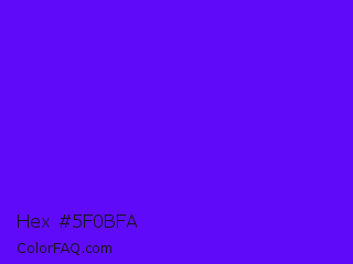 Hex #5f0bfa Color is a normal violet color and the nearest color is Han Purple #5218fa. Hex code #5f0bfa and RGB value is rgb(95,11,250). In RGB color space, this color is composed of 37% red, 4% green, 98% blue, In CMYK color space, this color is composed of 62% cyan, 96% magenta, 0% yellow , 2% black , In HSL color space, this color has a hue angle of 261° , 96% saturation and 51% lightness.