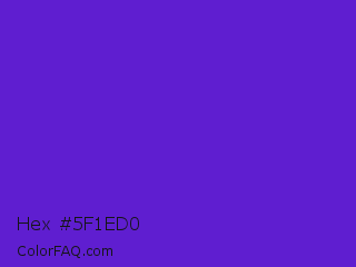 Hex #5f1ed0 Color is a normal violet color and the nearest color is Purple Heart Crayola #652dc1. Hex code #5f1ed0 and RGB value is rgb(95,30,208). In RGB color space, this color is composed of 37% red, 12% green, 82% blue, In CMYK color space, this color is composed of 54% cyan, 86% magenta, 0% yellow , 18% black , In HSL color space, this color has a hue angle of 262° , 75% saturation and 47% lightness.