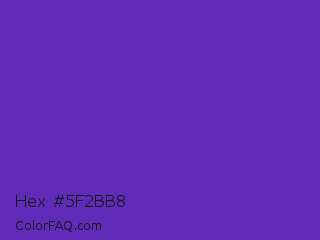 Hex #5f2bb8 Color is a normal violet color and the nearest color is Purple Heart Crayola #652dc1. Hex code #5f2bb8 and RGB value is rgb(95,43,184). In RGB color space, this color is composed of 37% red, 17% green, 72% blue, In CMYK color space, this color is composed of 48% cyan, 77% magenta, 0% yellow , 28% black , In HSL color space, this color has a hue angle of 262° , 62% saturation and 45% lightness.