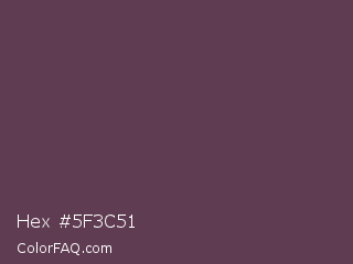 Hex #5f3c51 Color is a dark magenta color and the nearest color is Eggplant #614051. Hex code #5f3c51 and RGB value is rgb(95,60,81). In RGB color space, this color is composed of 37% red, 24% green, 32% blue, In CMYK color space, this color is composed of 0% cyan, 37% magenta, 15% yellow , 63% black , In HSL color space, this color has a hue angle of 324° , 23% saturation and 30% lightness.