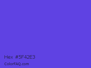 Hex #5f42e3 Color is a normal indigo color and the nearest color is Majorelle Blue #6050dc. Hex code #5f42e3 and RGB value is rgb(95,66,227). In RGB color space, this color is composed of 37% red, 26% green, 89% blue, In CMYK color space, this color is composed of 58% cyan, 71% magenta, 0% yellow , 11% black , In HSL color space, this color has a hue angle of 251° , 74% saturation and 57% lightness.