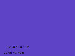 Hex #5f43c6 Color is a normal indigo color and the nearest color is Iris #5a4fcf. Hex code #5f43c6 and RGB value is rgb(95,67,198). In RGB color space, this color is composed of 37% red, 26% green, 78% blue, In CMYK color space, this color is composed of 52% cyan, 66% magenta, 0% yellow , 22% black , In HSL color space, this color has a hue angle of 253° , 53% saturation and 52% lightness.