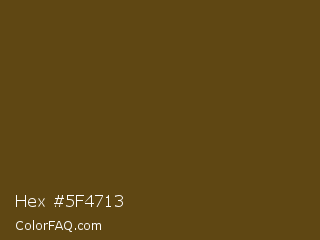 Hex #5f4713 Color is a very dark orange color and the nearest color is Horses Neck #604913. Hex code #5f4713 and RGB value is rgb(95,71,19). In RGB color space, this color is composed of 37% red, 28% green, 7% blue, In CMYK color space, this color is composed of 0% cyan, 25% magenta, 80% yellow , 63% black , In HSL color space, this color has a hue angle of 41° , 67% saturation and 22% lightness.