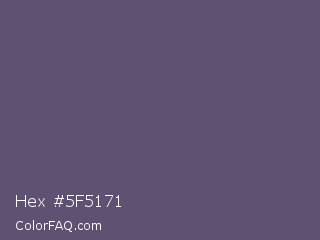 Hex #5f5171 Color is a normal violet color and the nearest color is Smoky #605b73. Hex code #5f5171 and RGB value is rgb(95,81,113). In RGB color space, this color is composed of 37% red, 32% green, 44% blue, In CMYK color space, this color is composed of 16% cyan, 28% magenta, 0% yellow , 56% black , In HSL color space, this color has a hue angle of 266° , 16% saturation and 38% lightness.