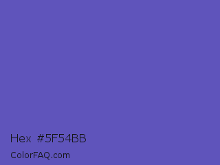 Hex #5f54bb Color is a normal indigo color and the nearest color is Blue Violet #6456b7. Hex code #5f54bb and RGB value is rgb(95,84,187). In RGB color space, this color is composed of 37% red, 33% green, 73% blue, In CMYK color space, this color is composed of 49% cyan, 55% magenta, 0% yellow , 27% black , In HSL color space, this color has a hue angle of 246° , 43% saturation and 53% lightness.