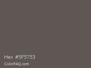 Hex #5f5753 Color is a normal orange color and the nearest color is Wenge #645452. Hex code #5f5753 and RGB value is rgb(95,87,83). In RGB color space, this color is composed of 37% red, 34% green, 33% blue, In CMYK color space, this color is composed of 0% cyan, 8% magenta, 13% yellow , 63% black , In HSL color space, this color has a hue angle of 20° , 7% saturation and 35% lightness.