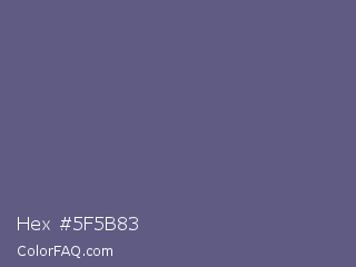 Hex #5f5b83 Color is a normal indigo color and the nearest color is Dolphin #646077. Hex code #5f5b83 and RGB value is rgb(95,91,131). In RGB color space, this color is composed of 37% red, 36% green, 51% blue, In CMYK color space, this color is composed of 27% cyan, 31% magenta, 0% yellow , 49% black , In HSL color space, this color has a hue angle of 246° , 18% saturation and 44% lightness.