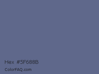 Hex #5f688b Color is a normal blue color and the nearest color is UCLA Blue #536895. Hex code #5f688b and RGB value is rgb(95,104,139). In RGB color space, this color is composed of 37% red, 41% green, 55% blue, In CMYK color space, this color is composed of 32% cyan, 25% magenta, 0% yellow , 45% black , In HSL color space, this color has a hue angle of 228° , 19% saturation and 46% lightness.