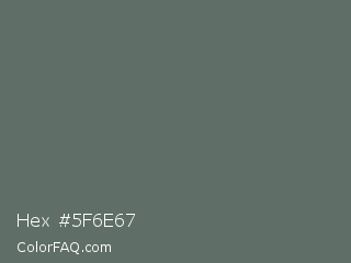 Hex #5f6e67 Color is a normal green color and the nearest color is Corduroy #606e68. Hex code #5f6e67 and RGB value is rgb(95,110,103). In RGB color space, this color is composed of 37% red, 43% green, 40% blue, In CMYK color space, this color is composed of 14% cyan, 0% magenta, 6% yellow , 57% black , In HSL color space, this color has a hue angle of 152° , 7% saturation and 40% lightness.