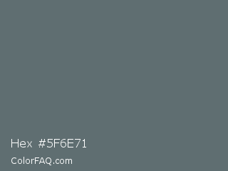 Hex #5f6e71 Color is a normal cyan color and the nearest color is Nevada #646e75. Hex code #5f6e71 and RGB value is rgb(95,110,113). In RGB color space, this color is composed of 37% red, 43% green, 44% blue, In CMYK color space, this color is composed of 16% cyan, 3% magenta, 0% yellow , 56% black , In HSL color space, this color has a hue angle of 190° , 9% saturation and 41% lightness.