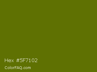 Hex #5f7102 Color is a dark yellow color and the nearest color is Avocado #568203. Hex code #5f7102 and RGB value is rgb(95,113,2). In RGB color space, this color is composed of 37% red, 44% green, 1% blue, In CMYK color space, this color is composed of 16% cyan, 0% magenta, 98% yellow , 56% black , In HSL color space, this color has a hue angle of 70° , 97% saturation and 23% lightness.