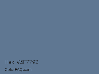 Hex #5f7792 Color is a normal blue color and the nearest color is Waikawa Gray #5a6e9c. Hex code #5f7792 and RGB value is rgb(95,119,146). In RGB color space, this color is composed of 37% red, 47% green, 57% blue, In CMYK color space, this color is composed of 35% cyan, 18% magenta, 0% yellow , 43% black , In HSL color space, this color has a hue angle of 212° , 21% saturation and 47% lightness.