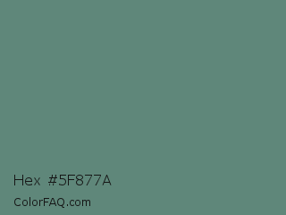 Hex #5f877a Color is a normal green color and the nearest color is Wintergreen Dream #56887d. Hex code #5f877a and RGB value is rgb(95,135,122). In RGB color space, this color is composed of 37% red, 53% green, 48% blue, In CMYK color space, this color is composed of 30% cyan, 0% magenta, 10% yellow , 47% black , In HSL color space, this color has a hue angle of 161° , 17% saturation and 45% lightness.