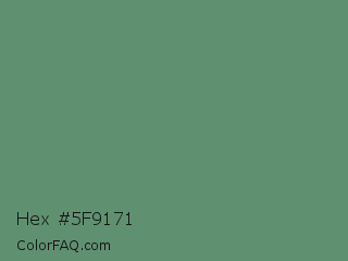 Hex #5f9171 Color is a normal green color and the nearest color is Viridian Green #678975. Hex code #5f9171 and RGB value is rgb(95,145,113). In RGB color space, this color is composed of 37% red, 57% green, 44% blue, In CMYK color space, this color is composed of 34% cyan, 0% magenta, 22% yellow , 43% black , In HSL color space, this color has a hue angle of 142° , 21% saturation and 47% lightness.