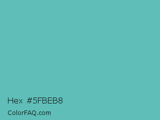 Hex #5fbeb8 Color is a normal cyan color and the nearest color is Fountain Blue #56b4be. Hex code #5fbeb8 and RGB value is rgb(95,190,184). In RGB color space, this color is composed of 37% red, 75% green, 72% blue, In CMYK color space, this color is composed of 50% cyan, 0% magenta, 3% yellow , 25% black , In HSL color space, this color has a hue angle of 176° , 42% saturation and 56% lightness.