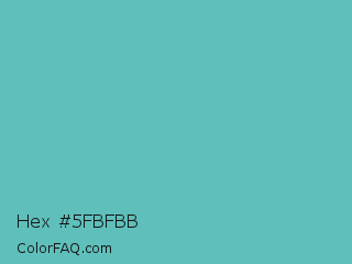 Hex #5fbfbb Color is a normal cyan color and the nearest color is Fountain Blue #56b4be. Hex code #5fbfbb and RGB value is rgb(95,191,187). In RGB color space, this color is composed of 37% red, 75% green, 73% blue, In CMYK color space, this color is composed of 50% cyan, 0% magenta, 2% yellow , 25% black , In HSL color space, this color has a hue angle of 178° , 43% saturation and 56% lightness.