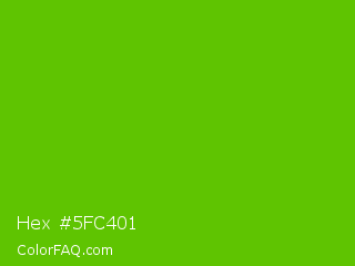 Hex #5fc401 Color is a normal green color and the nearest color is Kelly Green #4cbb17. Hex code #5fc401 and RGB value is rgb(95,196,1). In RGB color space, this color is composed of 37% red, 77% green, 0% blue, In CMYK color space, this color is composed of 52% cyan, 0% magenta, 99% yellow , 23% black , In HSL color space, this color has a hue angle of 91° , 99% saturation and 39% lightness.