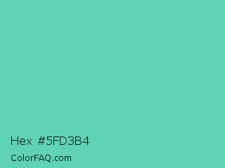 Hex #5fd3b4 Color is a normal cyan color and the nearest color is Medium Aquamarine #66ddaa. Hex code #5fd3b4 and RGB value is rgb(95,211,180). In RGB color space, this color is composed of 37% red, 83% green, 71% blue, In CMYK color space, this color is composed of 55% cyan, 0% magenta, 15% yellow , 17% black , In HSL color space, this color has a hue angle of 164° , 57% saturation and 60% lightness.