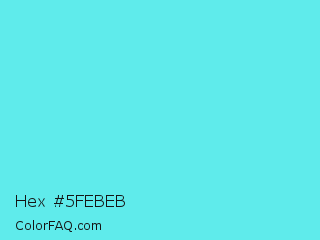 Hex #5febeb Color is a light cyan color and the nearest color is Turquoise Blue #6cdae7. Hex code #5febeb and RGB value is rgb(95,235,235). In RGB color space, this color is composed of 37% red, 92% green, 92% blue, In CMYK color space, this color is composed of 60% cyan, 0% magenta, 0% yellow , 8% black , In HSL color space, this color has a hue angle of 180° , 78% saturation and 65% lightness.